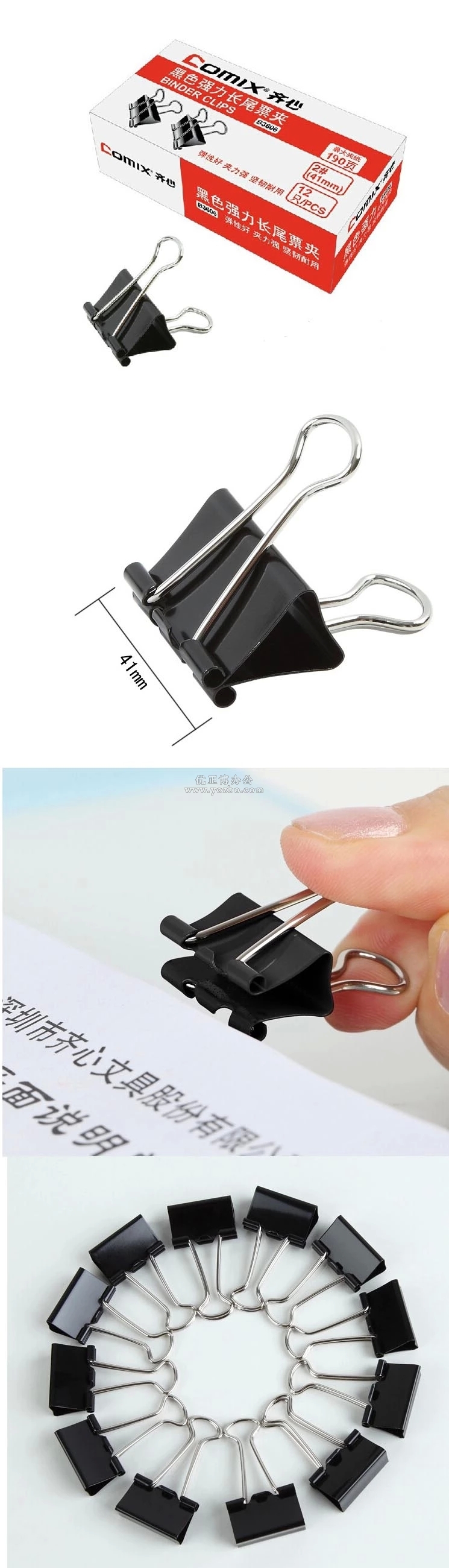 齊心B3606 黑色強力長尾票夾(1#,190頁,盒裝) ★高強度夾力,反復使用不松弛; ★金屬涂層,防銹更顯著; ★經濟實惠,環保,使用頻率最高的長尾夾; ★規格:41mm(2#),最大夾紙190頁,12只/盒;