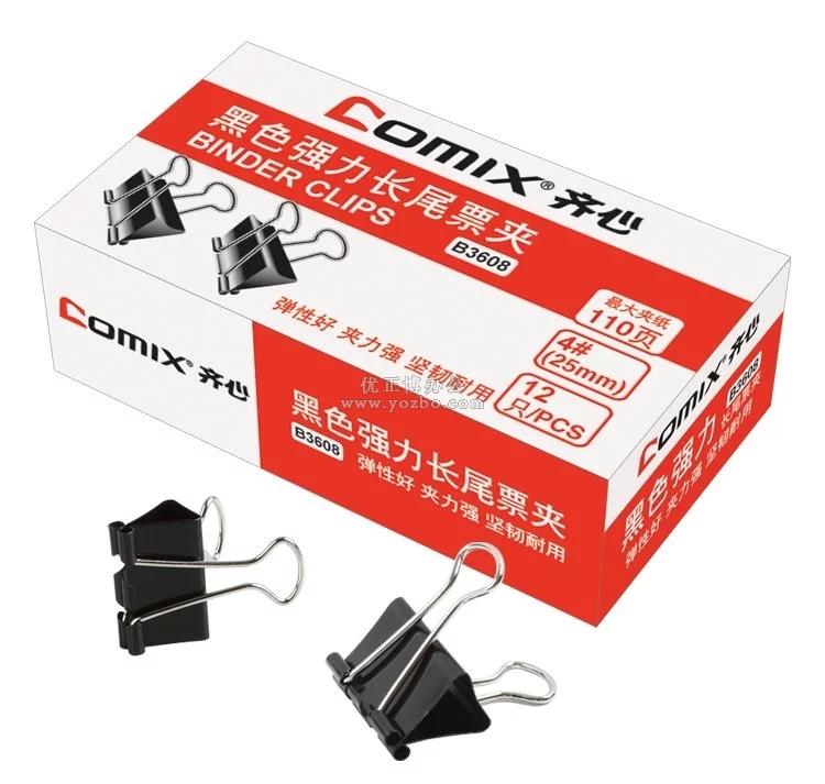 齊心B3608 黑色強力長尾票夾(4#,110頁,盒裝) ★高強度夾力,反復使用不松弛; ★金屬涂層,防銹更顯著; ★經濟實惠,環(huán)保,使用頻率最高的長尾夾; ★規(guī)格:25mm(4#),最大夾紙110頁,12只/盒;