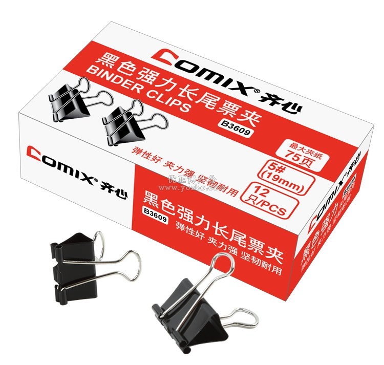 齊心B3609 黑色強力長尾票夾(5#,75頁,盒裝) ★高強度夾力,反復使用不松弛; ★金屬涂層,防銹更顯著; ★經濟實惠,環保,使用頻率最高的長尾夾; ★規格:19mm(5#),最大夾紙75頁,12只/盒;
