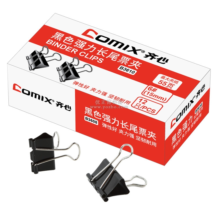 齊心B3610黑色強力長尾票夾(6#,55頁,盒裝) ★高強度夾力,反復使用不松弛; ★金屬涂層,防銹更顯著; ★經濟實惠,環保,使用頻率最高的長尾夾; ★規格:15mm(6#),最大夾紙55頁,12只/盒;