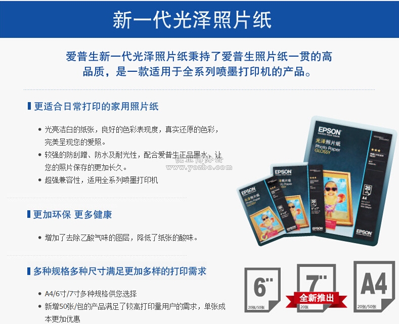 愛普生新一代光澤照片紙秉持了愛普生照片紙一貫的高品質,是一款適用于全系列噴墨打印機的產品。