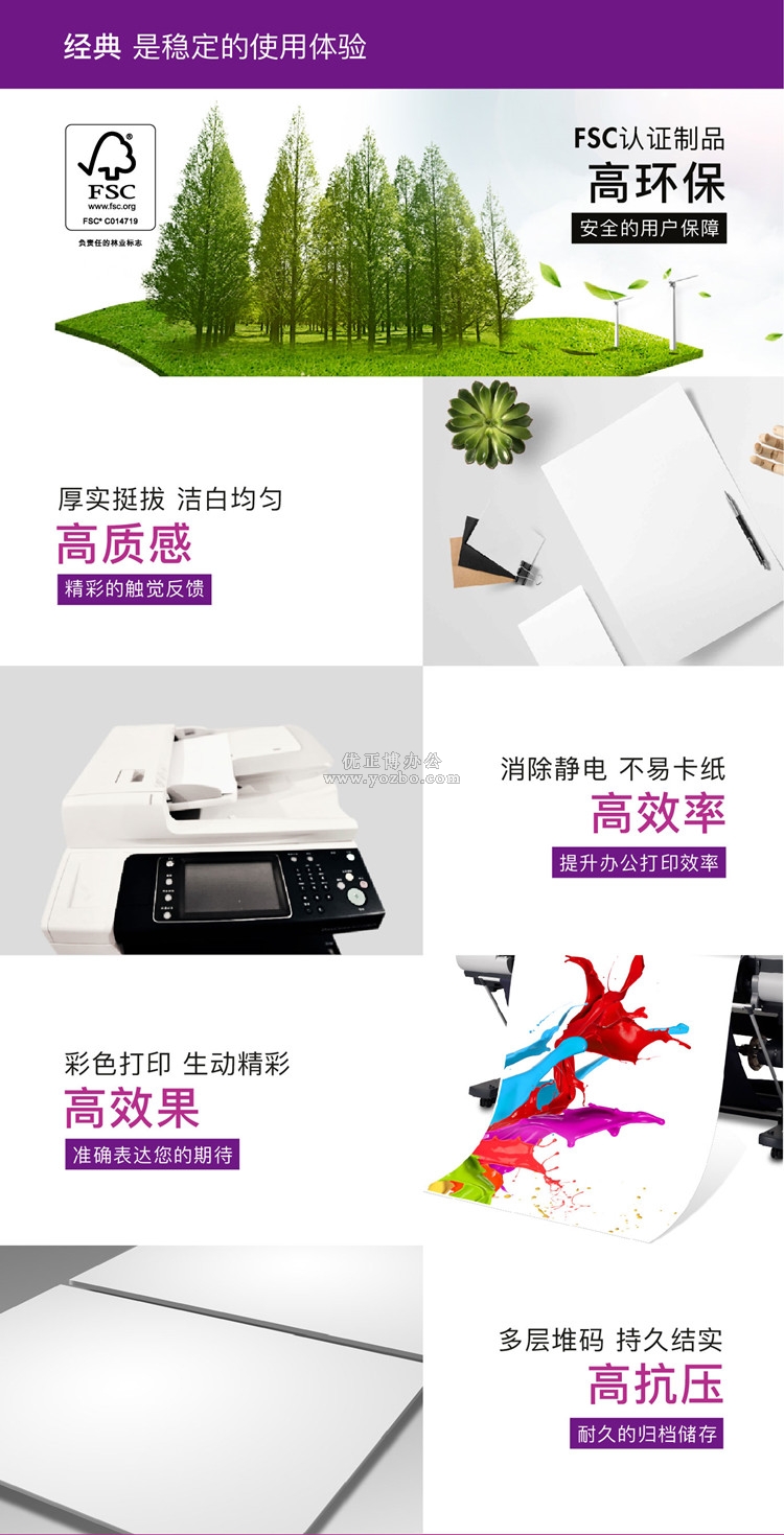 產品特點:品質保障,自始至終 最先進的紙機和裁切生產線、一流的造紙技術和熟練專業的技術員工。高質量的防潮包裝材料,品質承諾,自始至終。 還原色彩,與時俱進特殊軟壓光機和最新表面處理技術制造,無論是噴墨打印還是復印,都能向您呈現完美的圖文效果。與辦公設備制造商緊密合作,讓“欣樂”不斷成長,適應最新需要,讓您時刻享受復印的快樂!享受復印,拒絕卡紙五十多年辦公用紙的專業制造經驗,保證產品的高品質。每批次產品都嚴格檢測,控制紙張的卷曲,保證優異的運轉性能。全自動滾刀裁切機保證良好的裁切質量,避免多張進紙。實踐環保,綠色辦公。