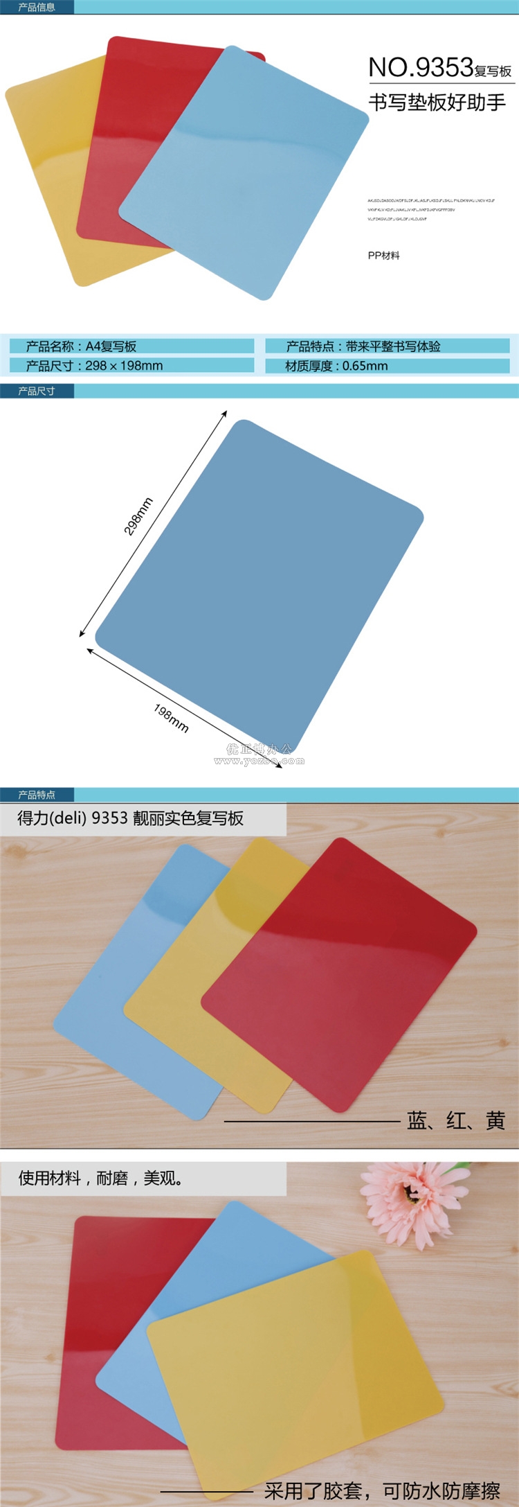> 辦公用品 > 桌面用品 > 復(fù)寫墊板 > 得力復(fù)寫板9353(298x 198mm)