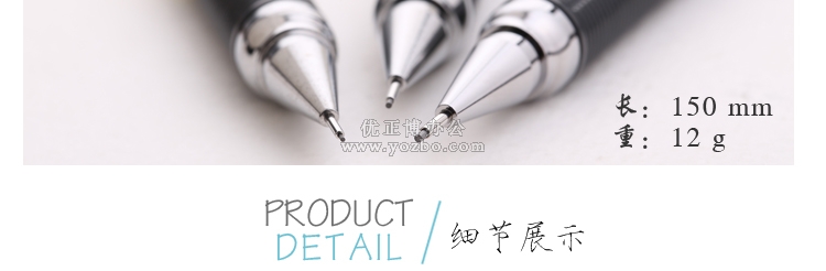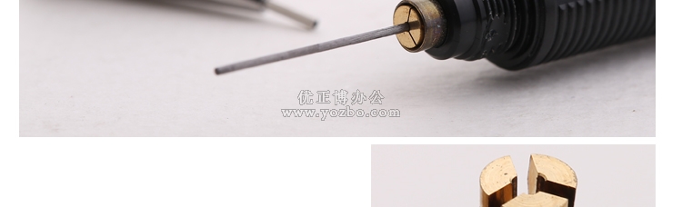 筆頂部帶有橡皮,帶有可調節的鉛芯指示器,螺紋狀握筆處十分舒適。